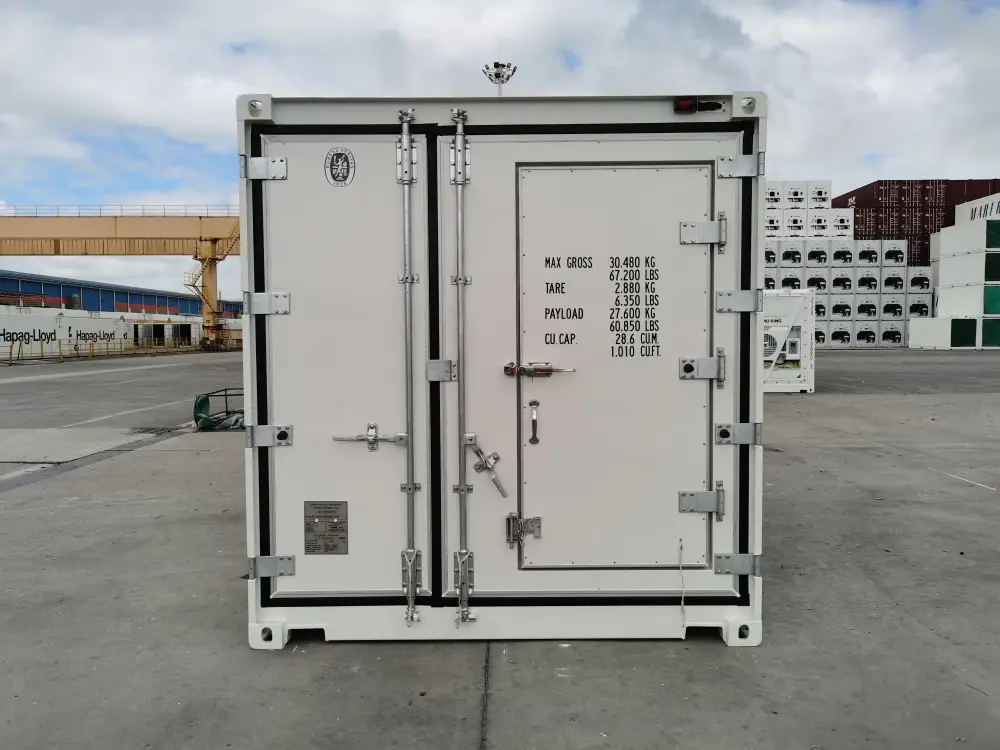 Reefer containers are constructed from a combination of materials: an outer shell of corrosion-resistant steel or aluminum, an inner lining of stainless steel or food-grade aluminum, and high-performance insulation layers in between. This multi-material design guarantees durability, thermal efficiency, weather protection, and security. Fully ISO certified, it meets all international standards for safe shipping. With a compact yet spacious design, it provides sufficient room for pallets, crates, or specialized refrigerated cargo, while remaining easy to handle and position.