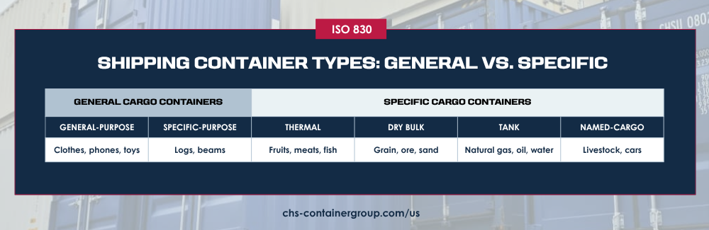 ISO 830 groups shipping containers based on the product categories they’re designed to move. Here are some of the most common container types listed in the standard.